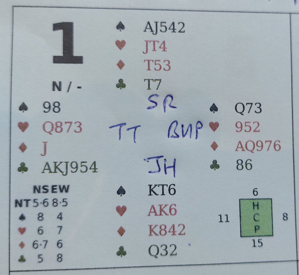 In the match between Harris and Dyson, Jonathan Harris opened the bidding with 1NT, partner Steve Root transferred to spades and Tom Townsend bid 3 clubs which ended the auction.