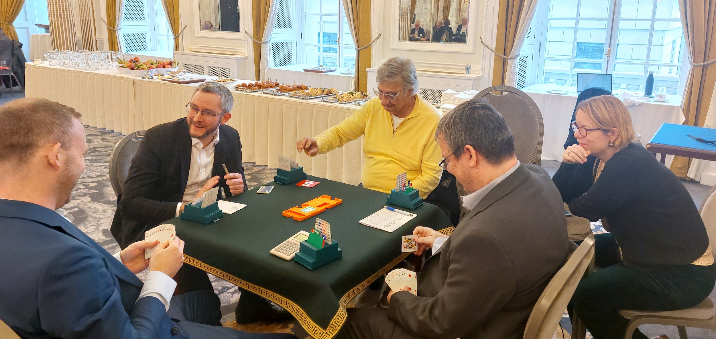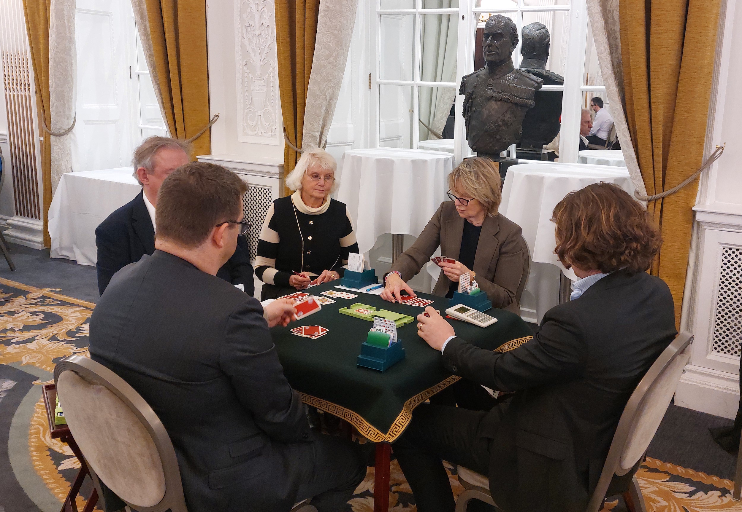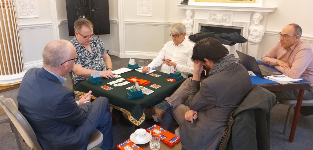 In the match between Harris and Dyson, Jonathan Harris opened the bidding with 1NT, partner Steve Root transferred to spades and Tom Townsend bid 3 clubs which ended the auction.