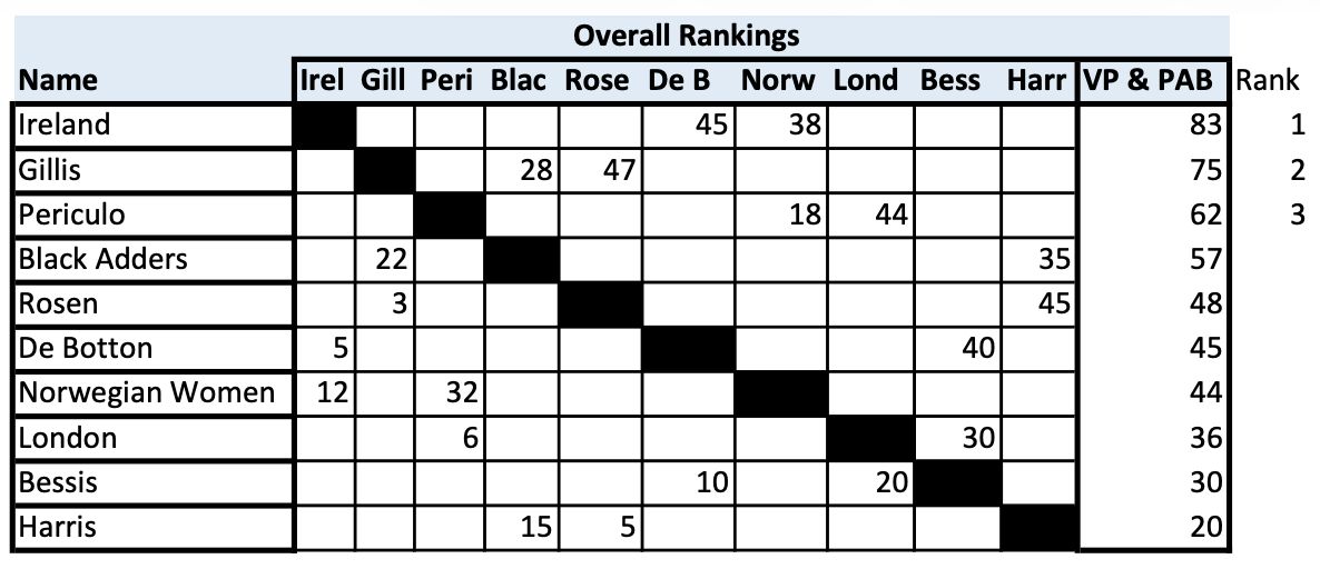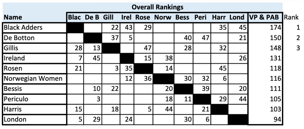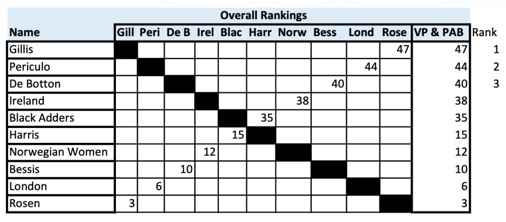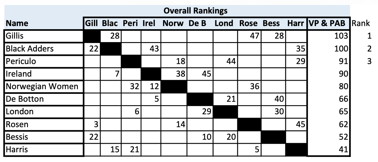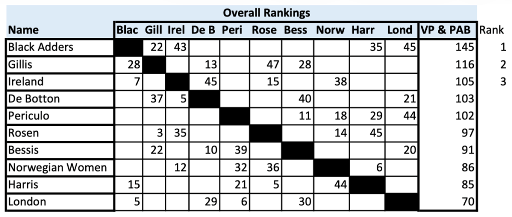 Gills take an early lead after a big win over Team Rosen. Periculo second, de Botton third. (TD tells me these results are somewhat provisional – I’ll update if there’s a change.)