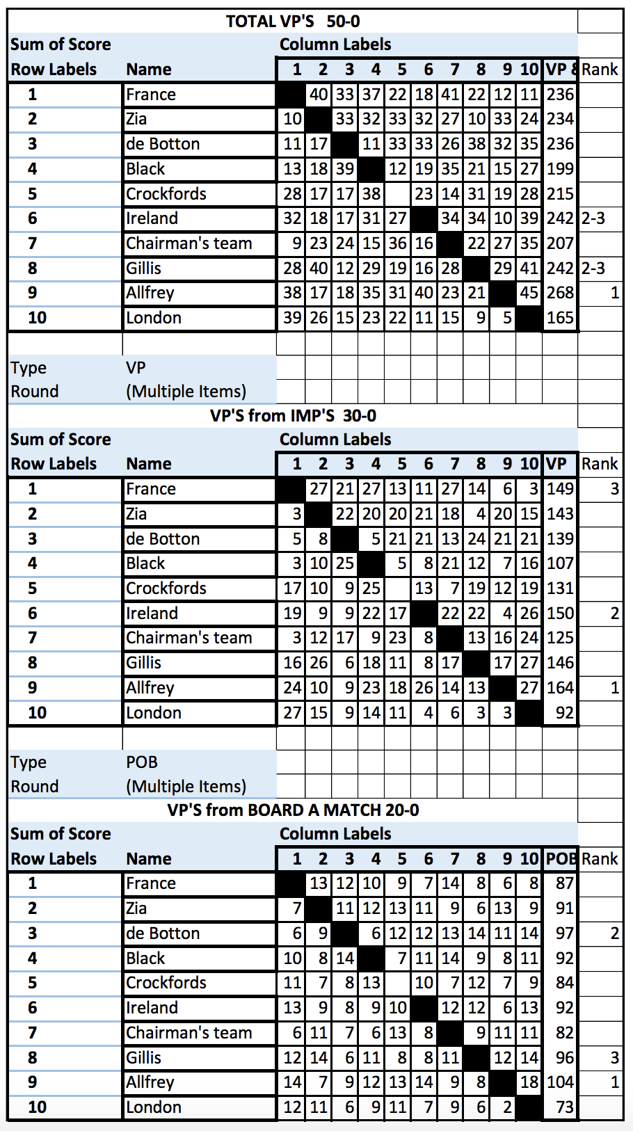 Butler IMPs and Hand Records Personal Scorecards