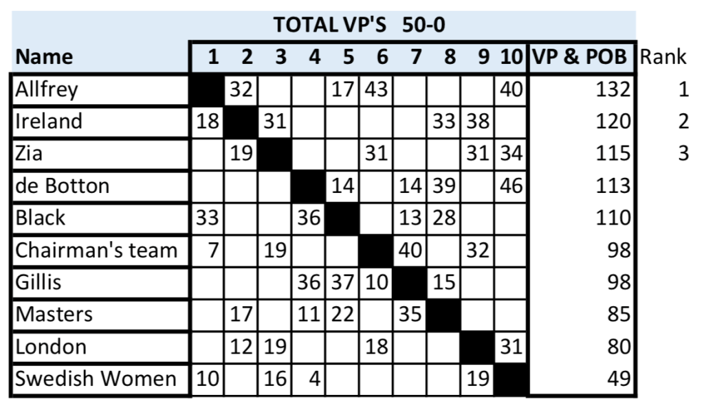 Allfrey still ahead, Ireland second after 4 Narrower lead now for Allfrey as they lose to Black. Ireland second, Zia moves into third. Share this: Click to share on X (Opens in new window) X Click to share on Facebook (Opens in new window) Facebook Like Loading... Related