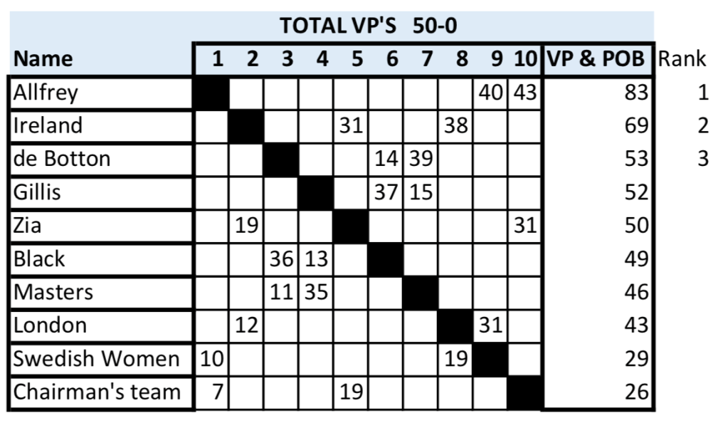 Still Allfrey after 2 Allfrey have increased their lead. Ireland and de Botton have changed places and are now second and third respectively. Share this: Click to share on X (Opens in new window) X Click to share on Facebook (Opens in new window) Facebook Like Loading... Related