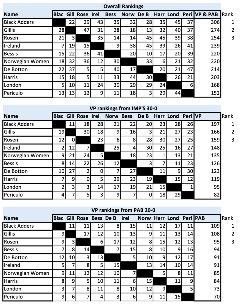 Black Adders for the win! Gillis second. Rosen, after a slightly dodgy start have a brilliant recovery to finish third. Well done everyone.