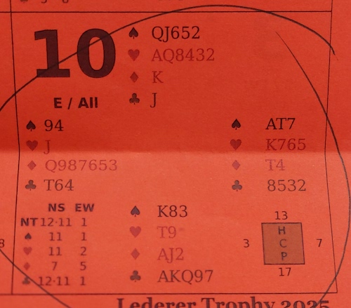 I’m reliably informed that playing on spades is better than hearts because after the pre-empt having the longer holding over north is likely to be more useful – gives you more chance of picking up the suit for enough tricks. (Thanks Claire Robinson and Paul Barden.)