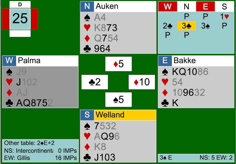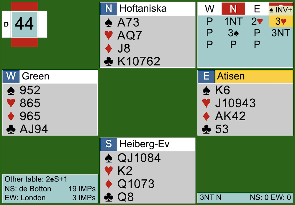 And well defended Ben Green and Sebastian Atisen on Board 46. Seb opened 1H as East. Ben bid 3C as a 4 card limit raise and after Seb bid 3H Thor Erik Hoftaniska protected as North with 3S. Ben now doubled this in the passout seat which may be essential to win the board if they make 3H (which they did at the other table).