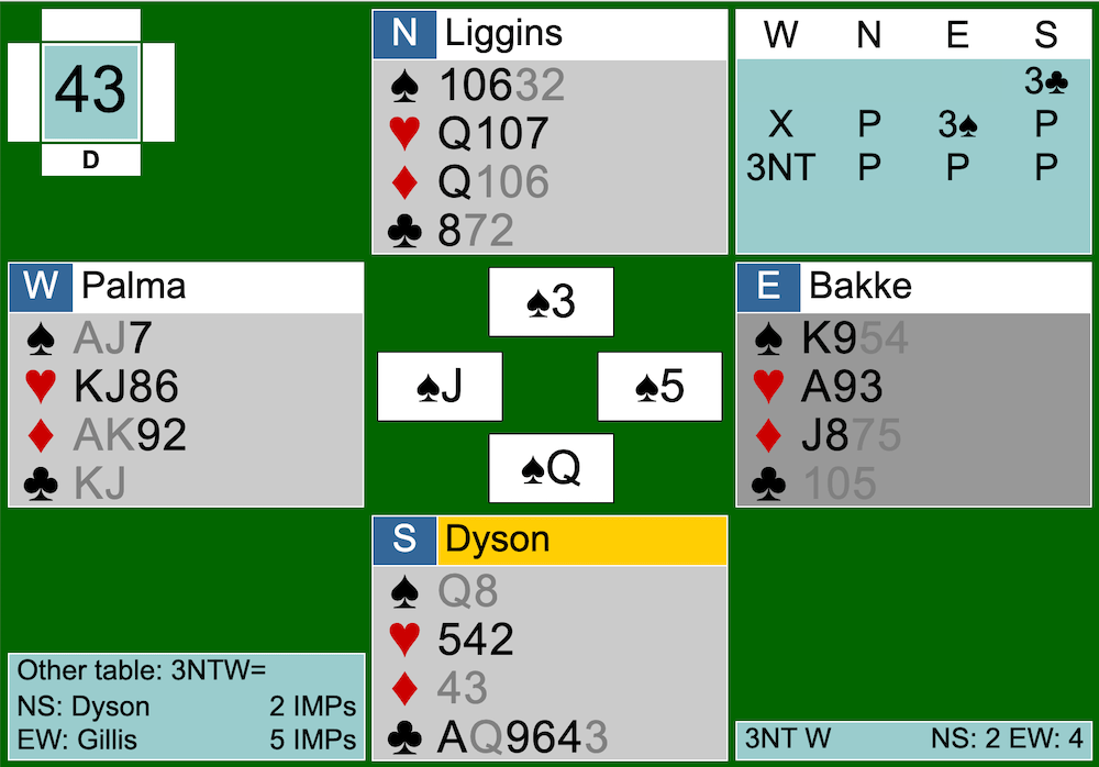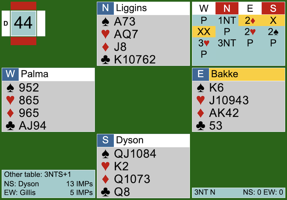 Well done to the pairs in 3NT on Board 44 from match 5 yesterday: