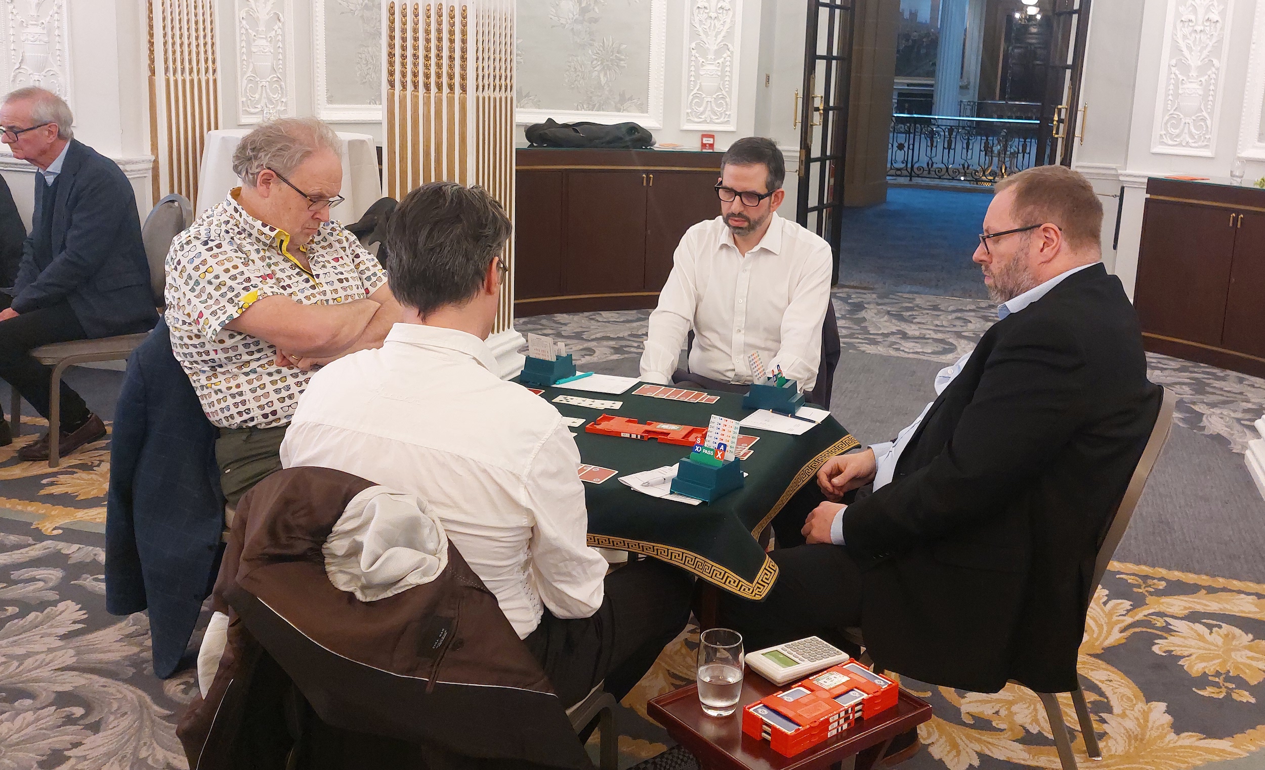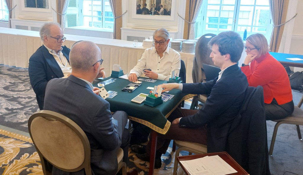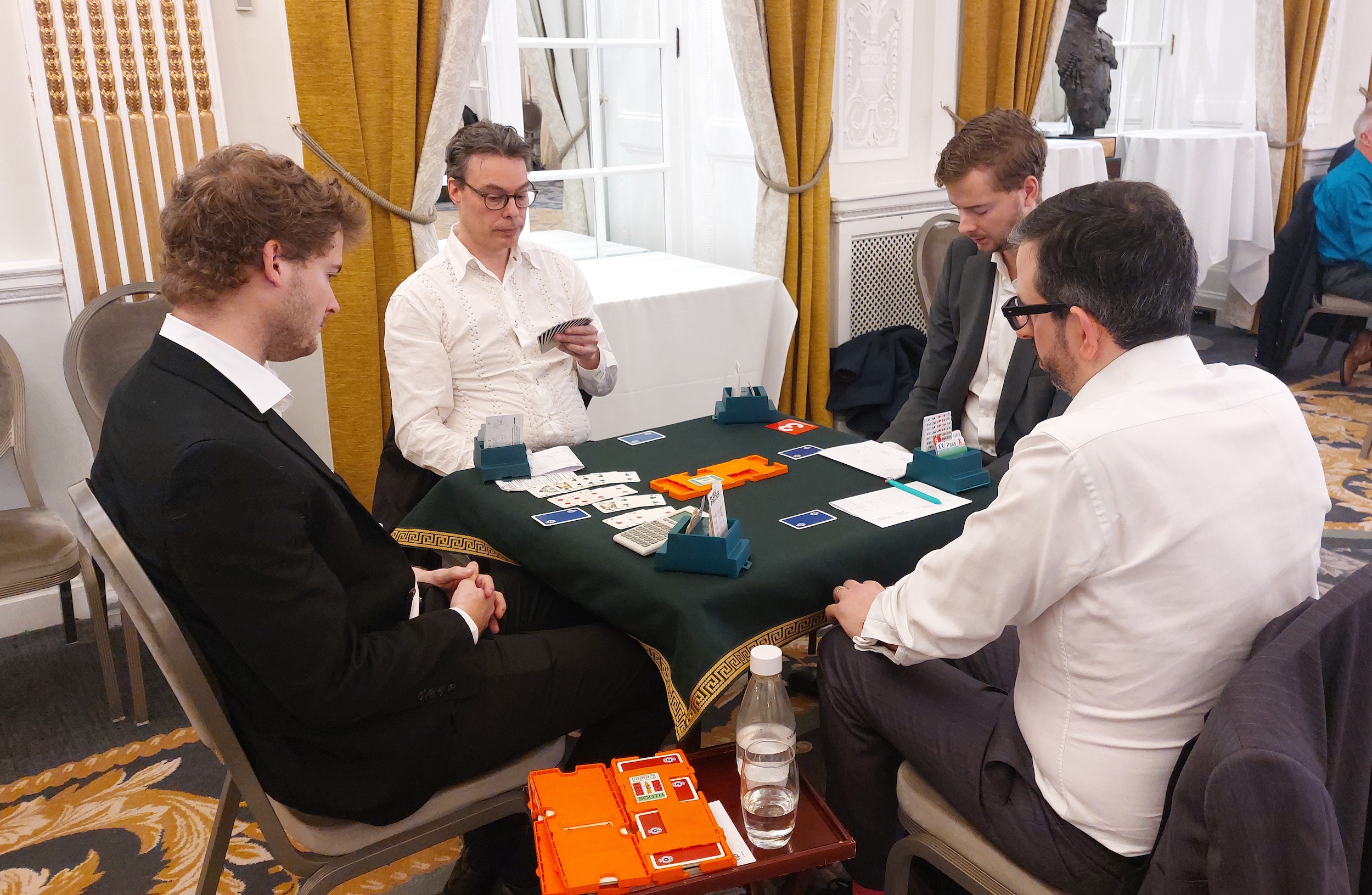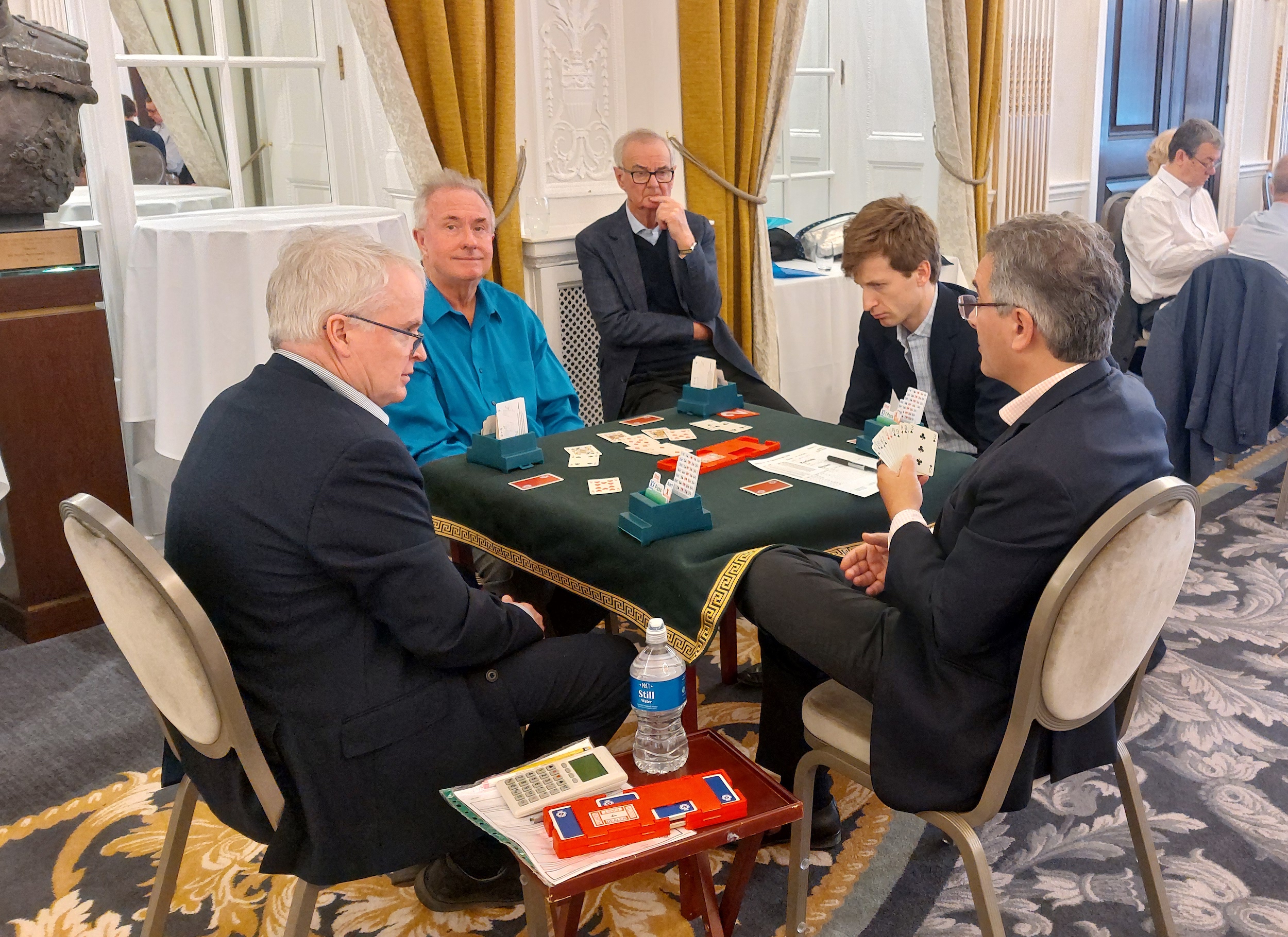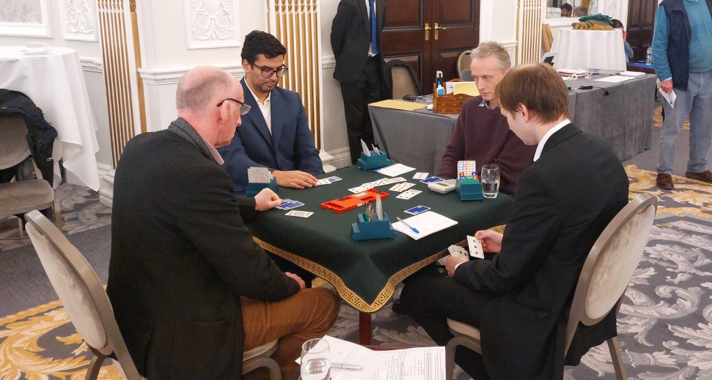 The defense led the ace of diamonds and switched to a trump. Declarer played low so Ben won and played ace and another club to get his ruff and then could give Seb a diamond ruff for +300. In theory they can get 500 if Seb switches to a club at trick two as then he can get two diamond ruffs but that is not at all obvious. In any case a very good double to win some IMPs and the Point-A-Board VPs. (Thanks to Ryan Stephenson for this hand.)