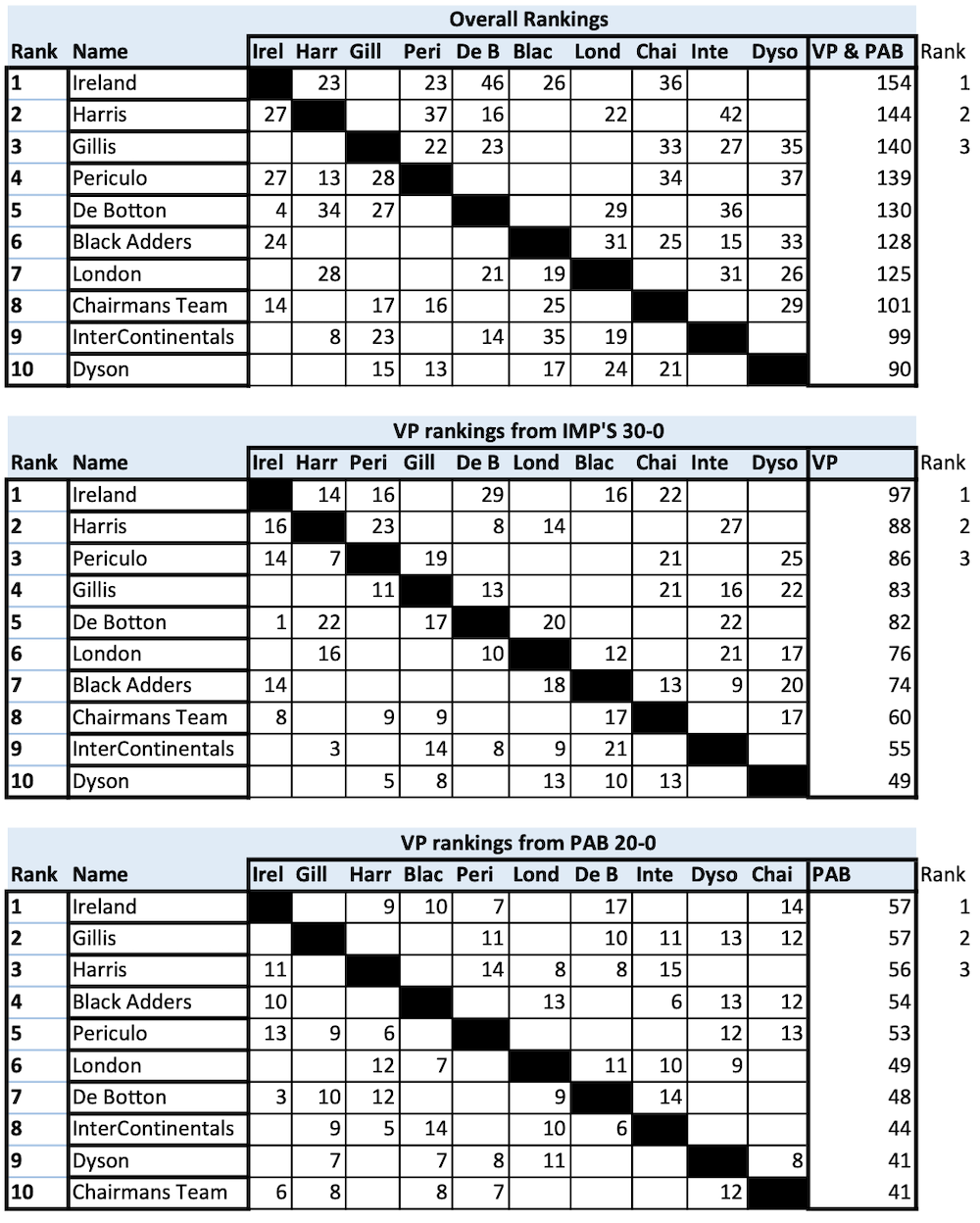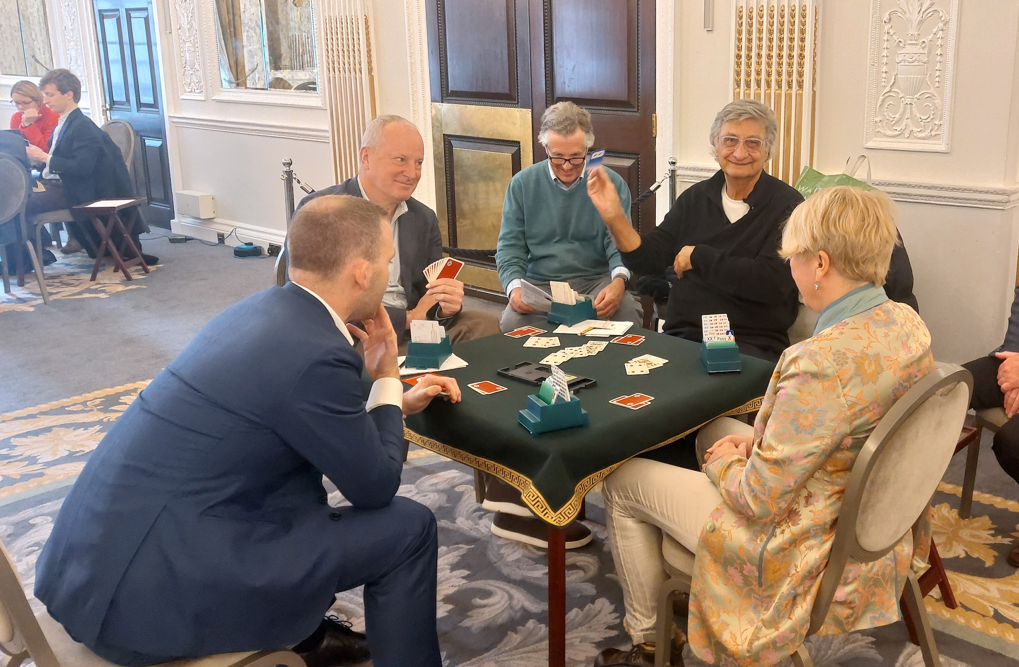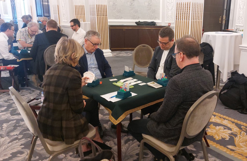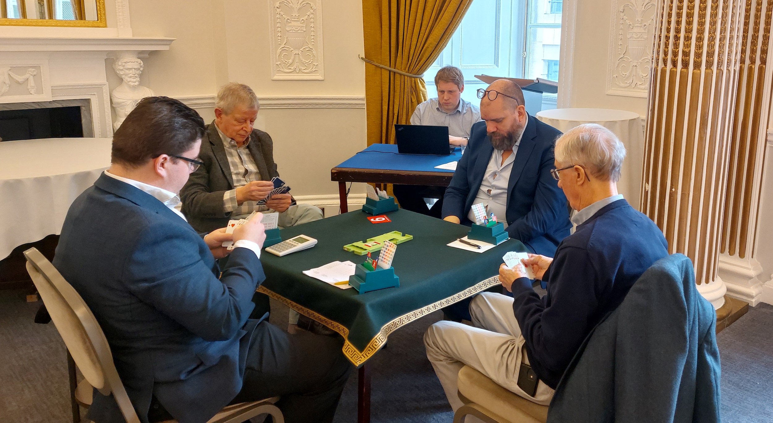 The defense led the ace of diamonds and switched to a trump. Declarer played low so Ben won and played ace and another club to get his ruff and then could give Seb a diamond ruff for +300. In theory they can get 500 if Seb switches to a club at trick two as then he can get two diamond ruffs but that is not at all obvious. In any case a very good double to win some IMPs and the Point-A-Board VPs. (Thanks to Ryan Stephenson for this hand.)