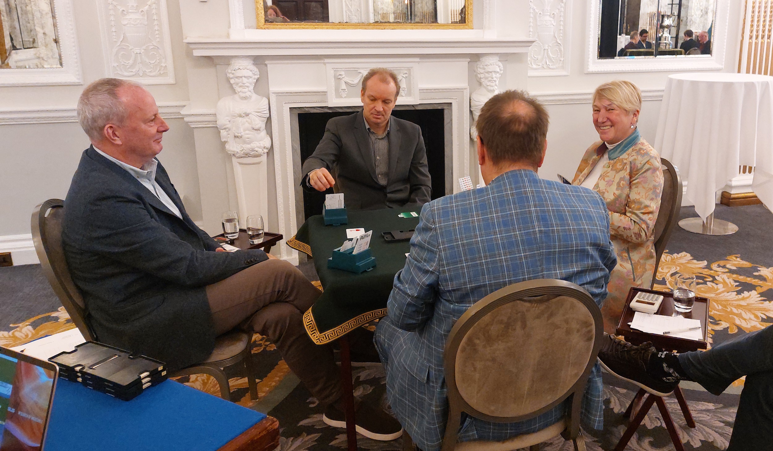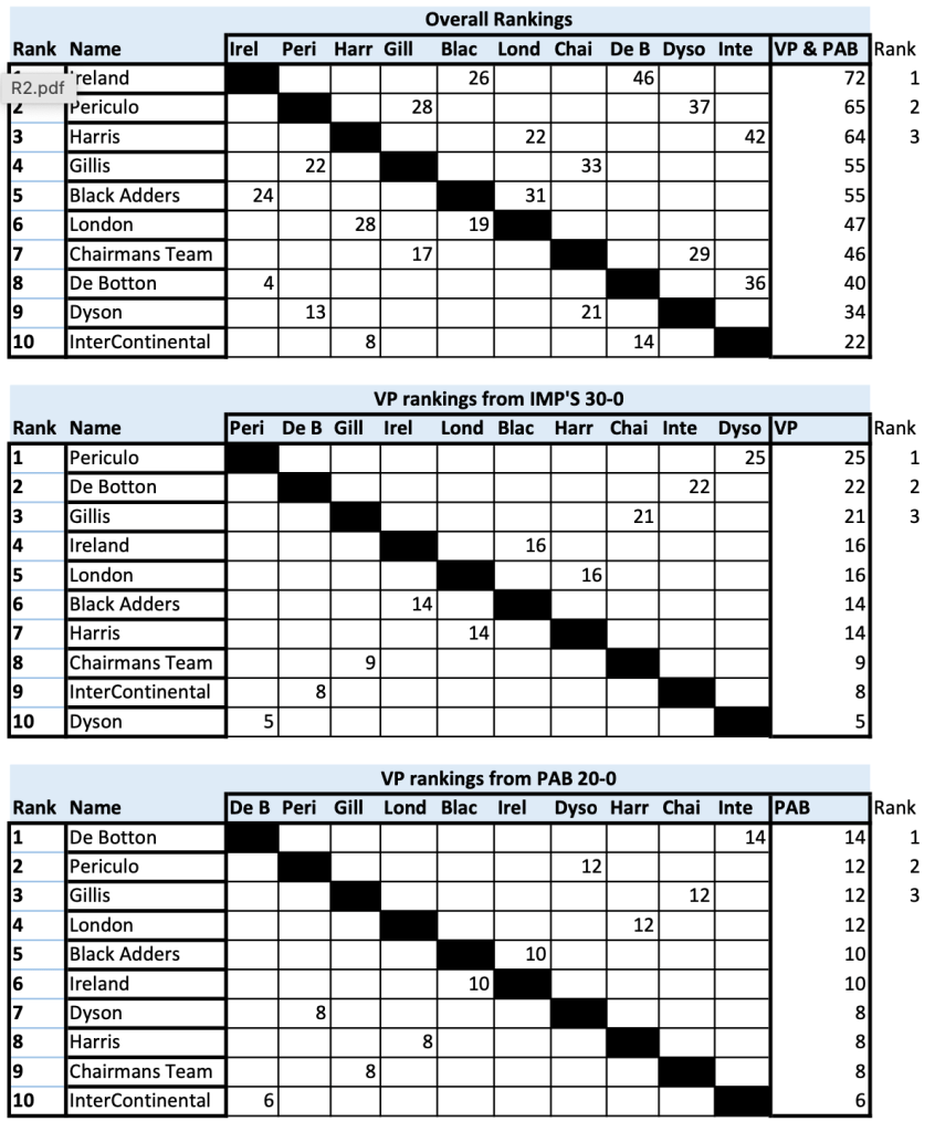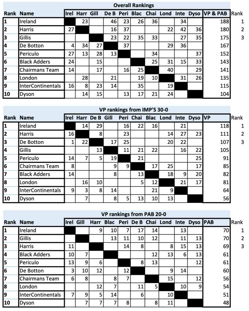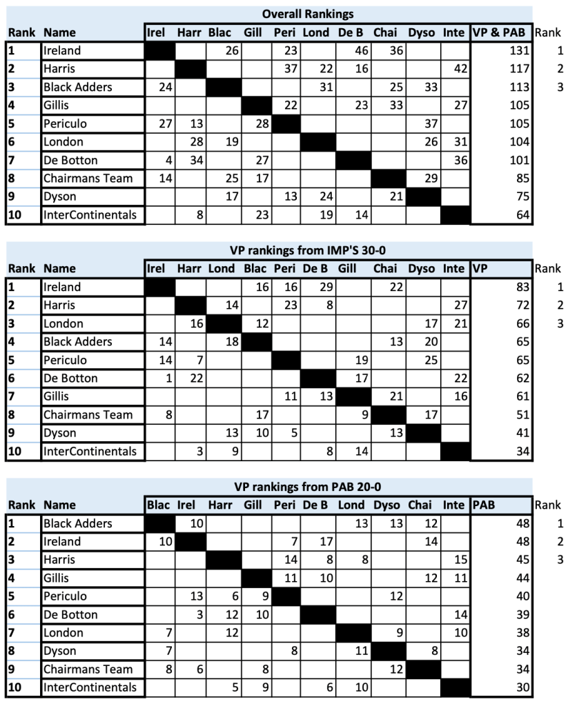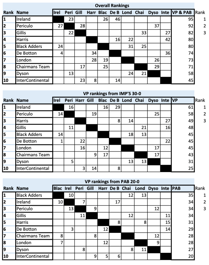 The defense led the ace of diamonds and switched to a trump. Declarer played low so Ben won and played ace and another club to get his ruff and then could give Seb a diamond ruff for +300. In theory they can get 500 if Seb switches to a club at trick two as then he can get two diamond ruffs but that is not at all obvious. In any case a very good double to win some IMPs and the Point-A-Board VPs. (Thanks to Ryan Stephenson for this hand.)