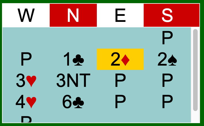 South (Team de Botton’s Nicolai Heiberg-Evenstad) didn’t open his hand. Instead North (Thor-Erik Hoftaniska) started with 1C. East (Adam Mesbur) bid 2D which showed both majors and the auction continued as shown below to 6C.